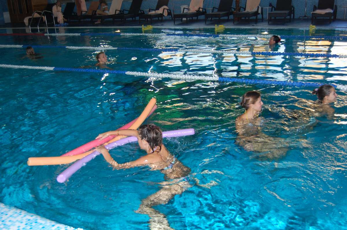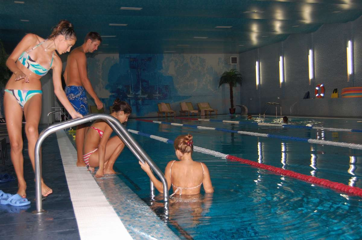 Бассейн имеет длину 25 м, глубину 2,5 м – 1,8 м, 4 плавательные дорожки. Температура воды +28 С, что дает возможность плавать детям самого младшего возраста, начиная с 1 года жизни. Так же комфортно себя в нем чувствуют и люди преклонных лет.