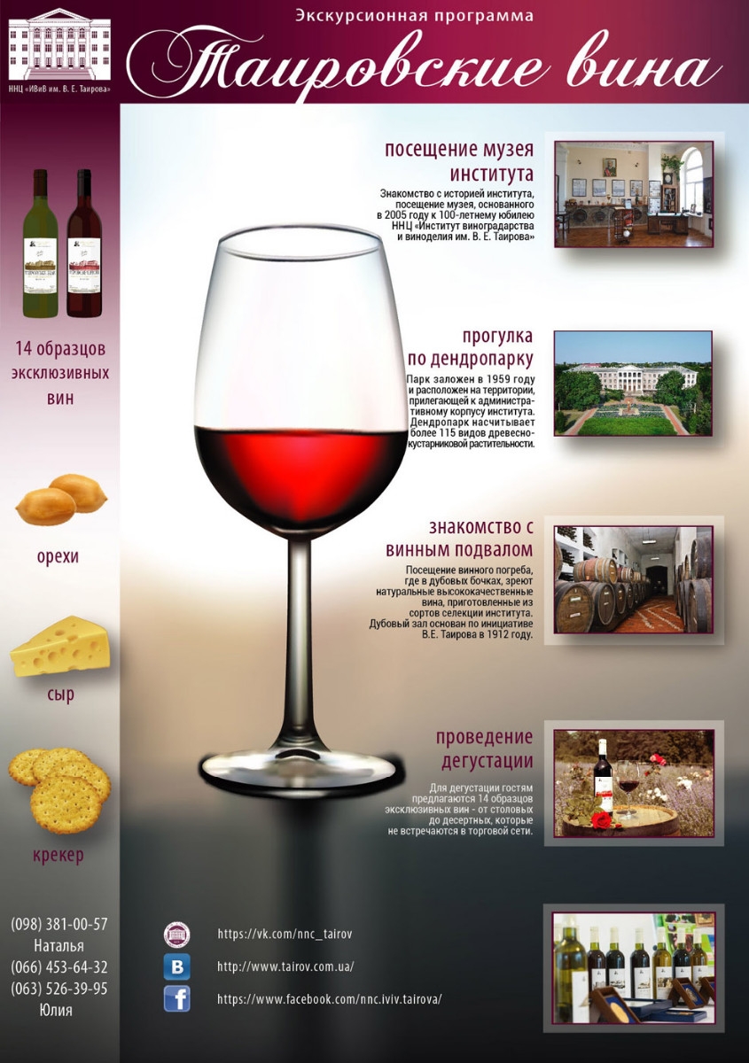Представляем Вашему вниманию краткую информацию о возможности экскурсионного посещения Национального научного центра «Институт виноградарства и виноделия им. В. Е. Таирова» – ведущего научно-исследовательского учреждения в Украине в области виноградарства и виноделия.