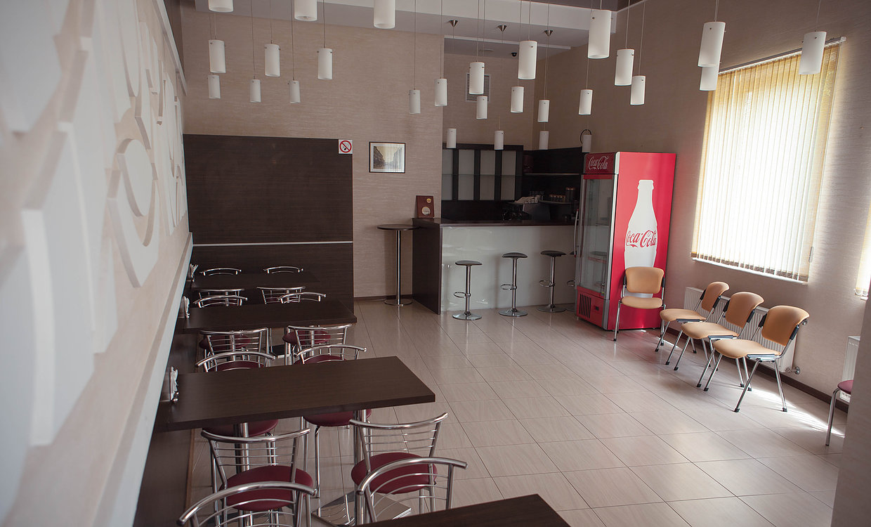 За барним прилавком з високими стільцями можна випити чашечку ароматного кофе, насолодитися легкими закусками, смачним десертом від нашого кондитера та подивитися передачу новин на великому плазмовому екрані.